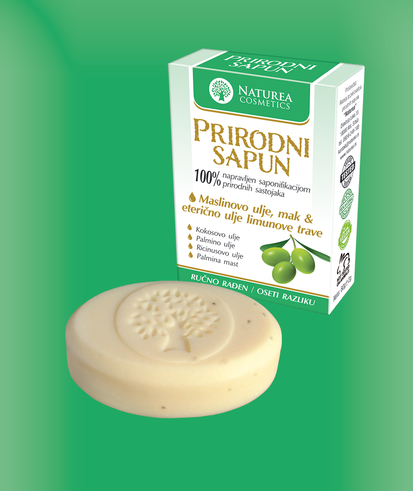 Saponifikovana ulja palme, masline, kokosa, ricinusa, palmina mast, voda, mak, eterično ulje