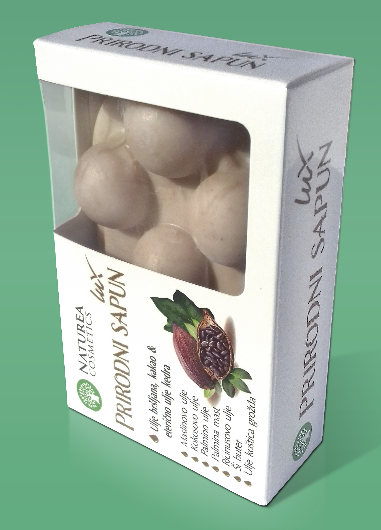 Saponifikovana ulja palme, masline, kokosa, ricinusa, palmina mast, voda, kakao prah, eterično