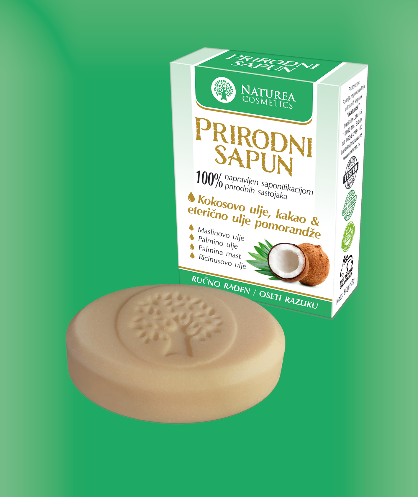 Saponifikovana ulja palme, masline, kokosa, ricinusa, badema i nevena, ši buter, kakao buter,voda i eterično ulje čajnog drveta.