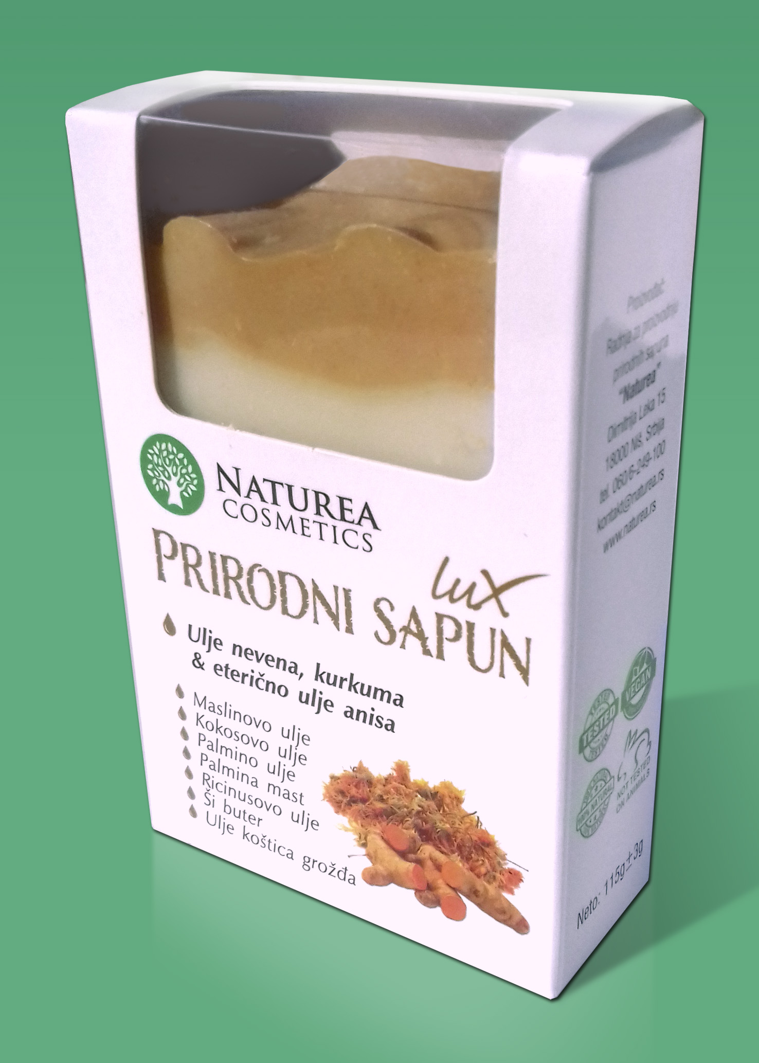 Saponifikovana ulja palme, kokosa, ricinusa, masline, ši buter, koštica grožđa, ulje nevena, palmina mast, voda, eterično ulje anisa, kurkuma.
