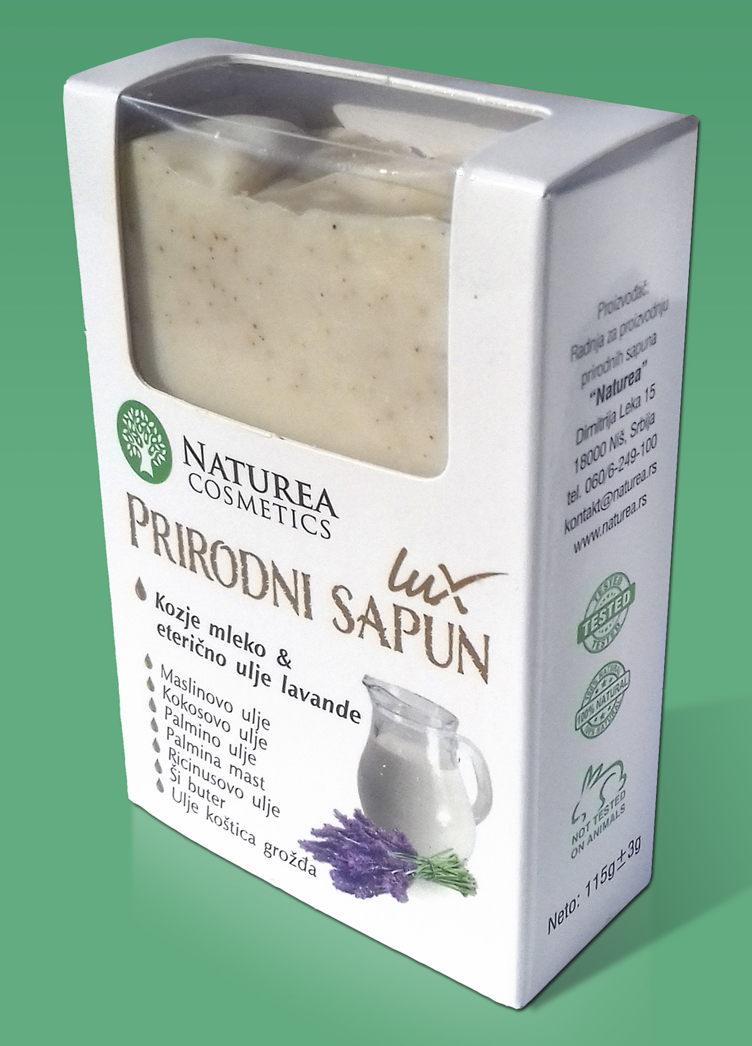 Saponifikovana ulja palme, masline, kokosa, ricinusa, palmina mast, voda, kozje mleko, eterično