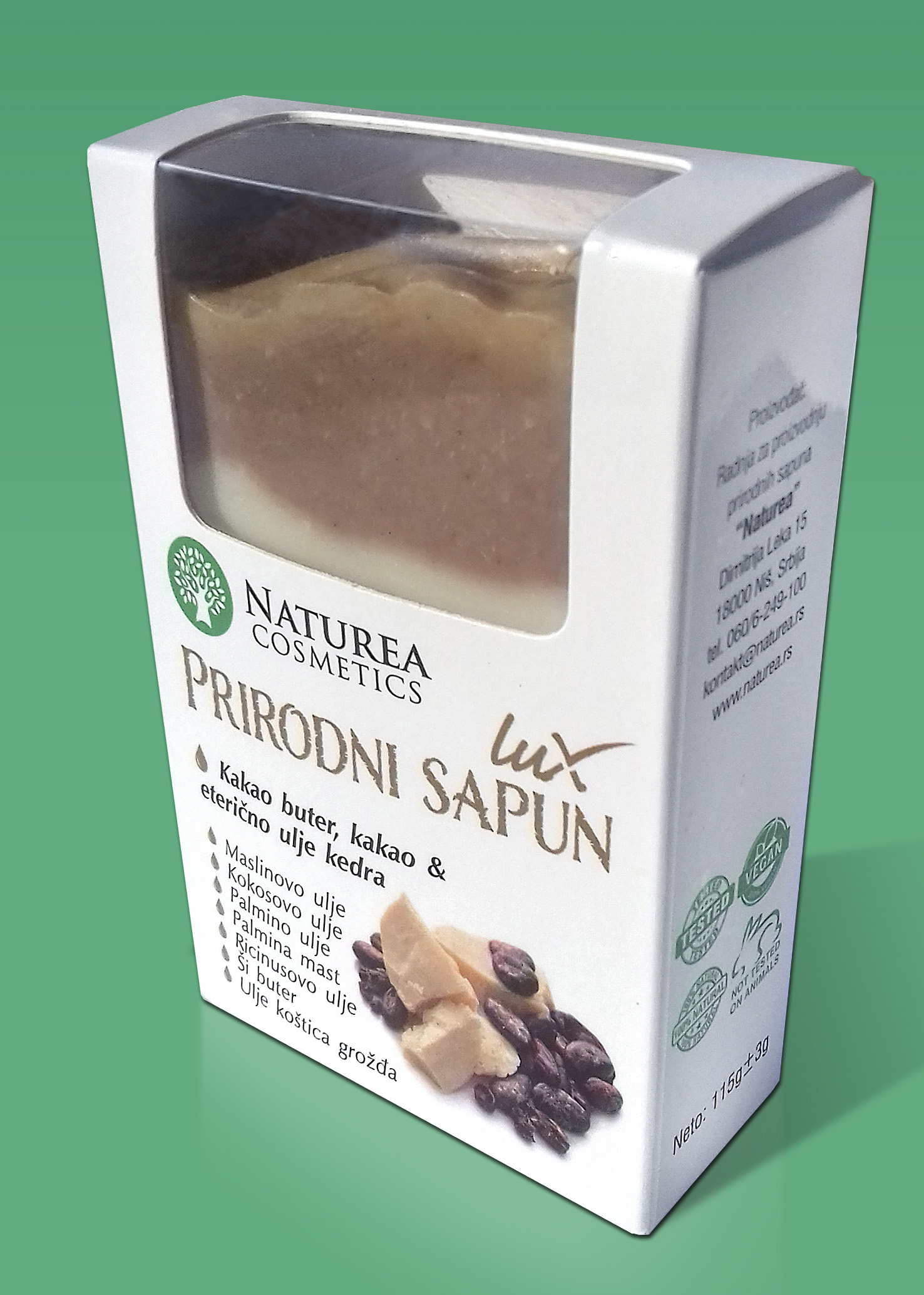 Saponifikovana ulja palme, kokosa, ricinusa, masline, ši buter, koštica grožđa, kakao buter, palmina mast, voda, eterično ulje pomorandže, eterično ulje kedra, kakao prah.